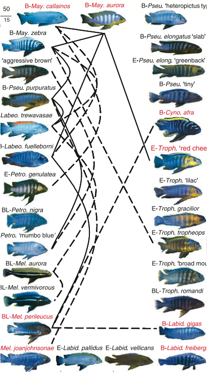 How competition affects individuals and communities is one of my favourite topics. For example, how does body size affect competitive behaviour? Do pairwise competitive interactions scale up to predict community structure? How do competitive interactions at one trophic level affect other trophic levels? I often use simple stream dwelling salmonid communities. They are great because you can manipulate relevant variables in lab and field experiments, then relate your results to the (vast!) literature on how populations and communities are structured in the wild. More recently I have started using invasive crayfish, a system ripe for experiments exploring how invasive species and habitat degradation interact to affect ecosystems. I also use the famously species rich rock cichlids of Lake Malawi to explore how male traits like body colour affects competitive interactions and community structure during adaptive radiation (complexity evidenced by silly figure of interaction coefficients to left).